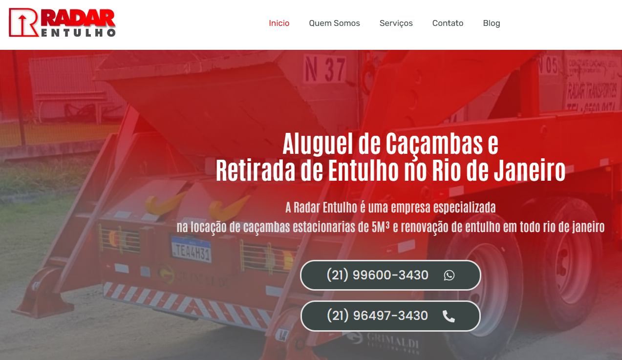 Um site moderno e responsivo, criado especialmente para a Radar Entulho — referência em locação de caçambas e retirada de entulho no Rio de Janeiro.