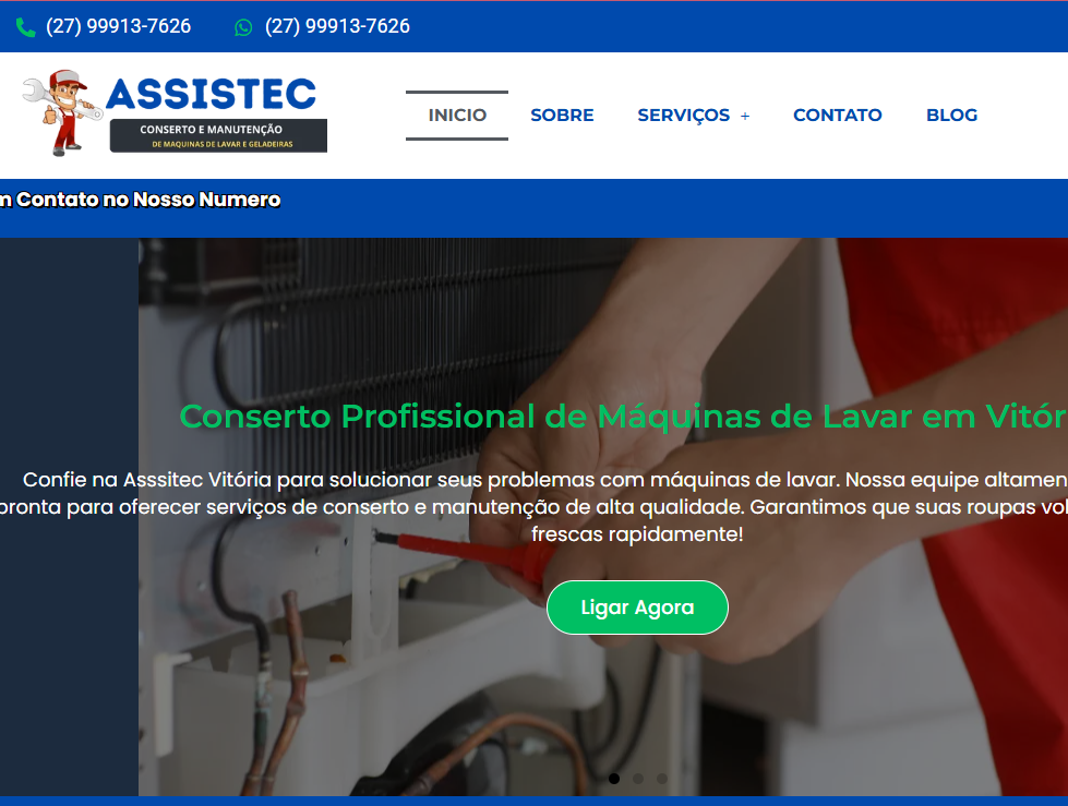 Um site moderno, responsivo e informativo criado para Assistec Vitória, referência em conserto e manutenção de eletrodomésticos com mais de 25 anos de experiência